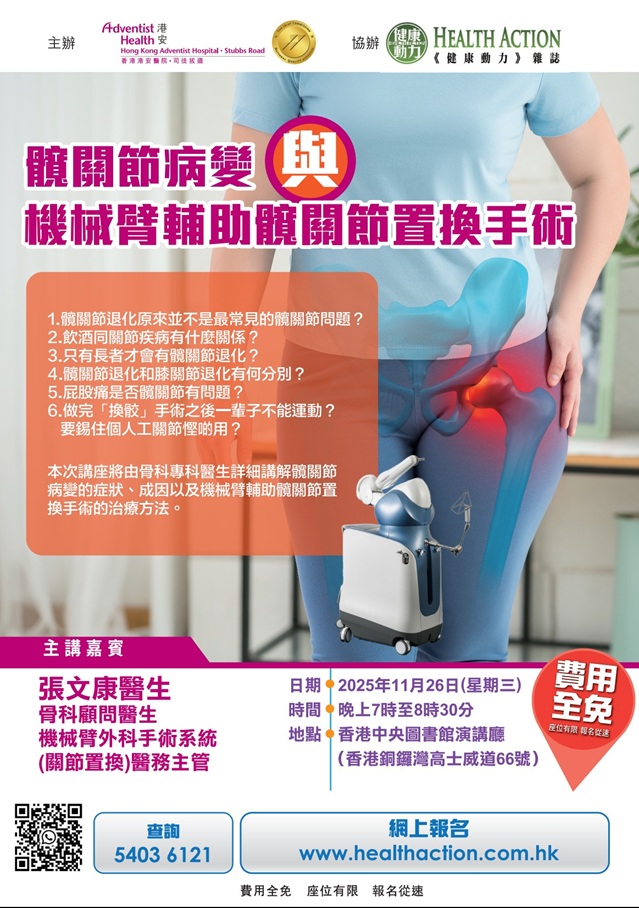 香港港安醫院 - 司徒拔道健康講座系列:【髖關節病變與機械臂輔助髖關節置換手術】醫學專題講座